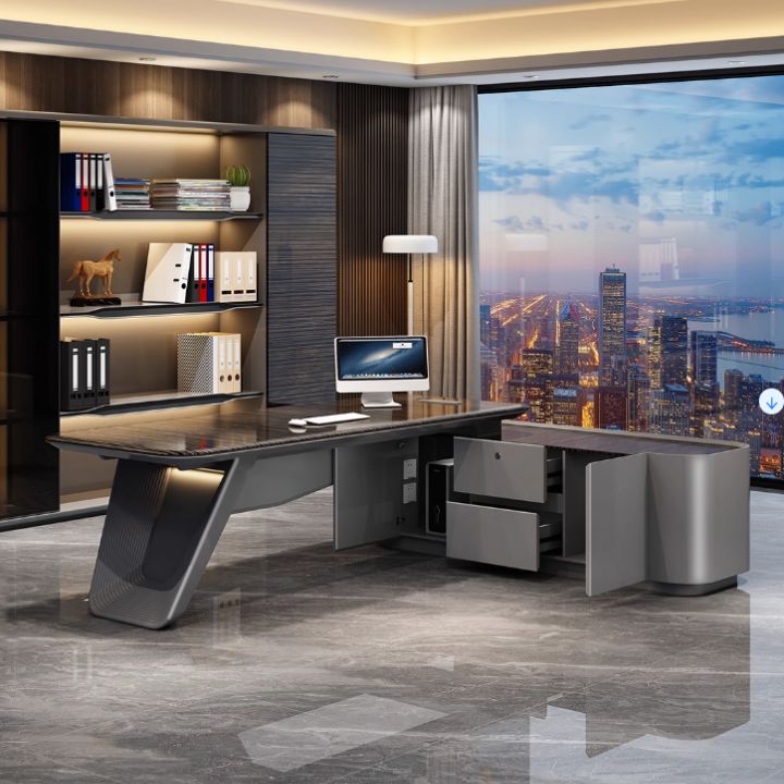🔹Thiết kế sang trọng – đẳng cấp doanh nhân: Kiểu dáng hiện đại, đường nét mềm mại kết hợp màu xám titan và vân gỗ đen bóng giúp tôn lên vẻ quyền lực, chuyên nghiệp của không gian lãnh đạo.