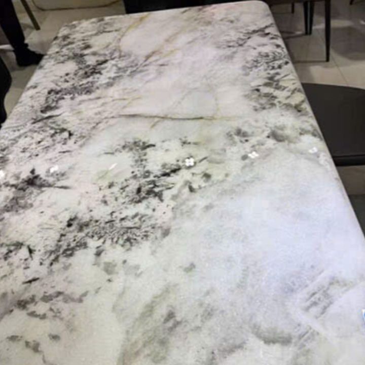 Mặt bàn đá với những đường vân tự nhiên độc đáo, bề mặt sáng bóng giúp tăng tính thẩm mỹ, đồng thời dễ lau chùi và giữ được vẻ đẹp bền lâu theo thời gian.
