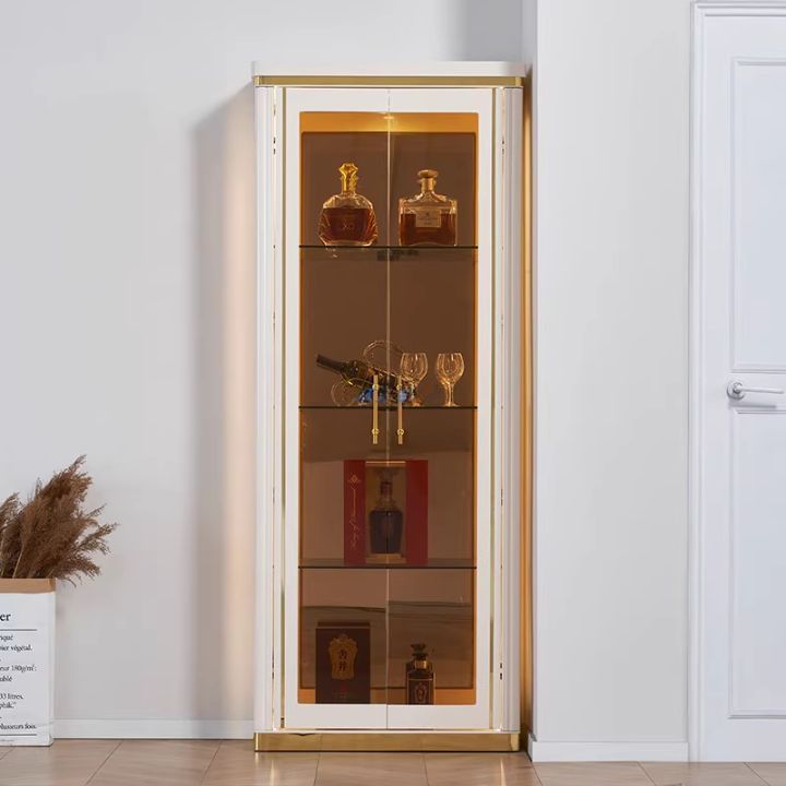 Đèn LED tích hợp: Ánh sáng vàng ấm giúp tôn lên vẻ đẹp của rượu và đồ decor trưng bày bên trong.